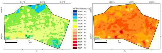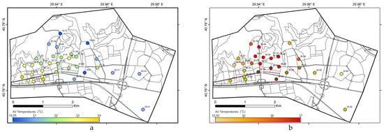 Although the measurements were complete in approximately one hour, considering that a temperature change had taken place, a time normalization that is common in UHI investigations was applied [23,75,89,90]. The Ta observation was adjusted to the mid-time based on fixed weather station measurements located in the city. Assuming that the time change rate is linear between the planned start and end times of the campaign, a unified time was defined as the mid-time, rather than the beginning or the end in an attempt to distribute possible errors more uniformly along the time span. Accordingly, for daytime observations, the unified reference time was set as 14:30, where the temperature difference between the beginning and the end (14:00, 15:00) is +0.33 °C. For nighttime observations, the unified reference time was set as 23:30, where the temperature difference between the beginning and the end (23:00, 00:00) is −1.2 °C. A temporal adjustment of 0 to max ±0.16 and 0 to max ±0.6 was made on the observed Ta values for daytime and nighttime observations, respectively.