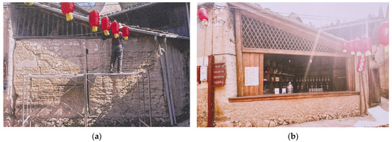 One of traditional building in Beiqian Village. (a) The building in the village before the renovation; (b) the building in the village after the renovation (image source: Wu Shandi’s photograph (The use of these photographs was authorized by Wu Shandi, a member of the village leaders of Beiqian Village, 2023)).