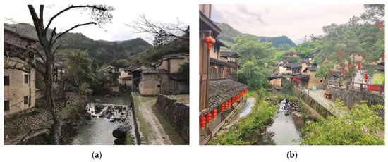 River landscape in Longtan Village. (a) Before tourism development (image source: Chen Xiaozhen’s photograph (The use of this photograph was authorized by Chen Xiaozhen, a member of the village leaders of Longtan Village, 2023)). (b) After tourism development (image source: Xia Xingyong’s Master thesis [49]).