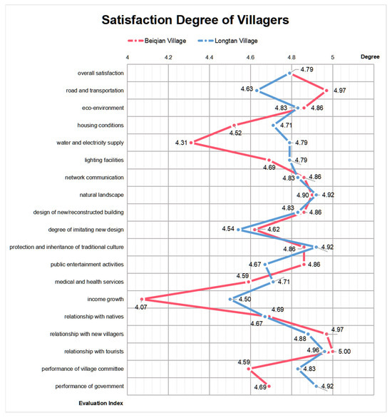 In terms of economic and social development, Longtan villagers’ satisfaction with income growth (4.50) was significantly higher than that of Beiqian Village (4.07), but the satisfaction with public entertainment activities (4.67) was lower than that of Beiqian Village (4.86). The two villages’ satisfaction with medical and health services were similar.