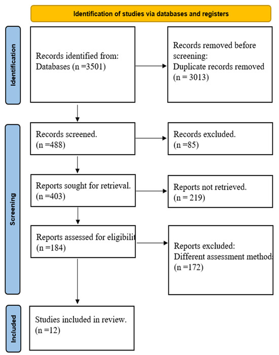 In the initial search of the databases, a total of 3501 papers were found. After removing duplicates, 488 papers were screened based on their title and abstract, with 219 being excluded. Of the remaining 184 papers, 12 were ultimately selected for the full-text review. The PRISMA flow diagram is explained in Figure 1.
