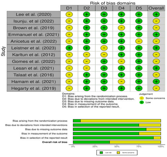 Among the twelve studies analyzed [33,34,35,36,37,38,39,40,41,42,43,44], in the risk of bias assessment of the included studies, varying degrees of bias risk are observed, reflecting the diversity of study designs (Figure 2). Several studies, such as Lee et al. (2022), Isunju et al. (2022), and Saadeh et al. (2022) [41,42,43], demonstrate some concerns related to the randomization process, indicating potential selection bias. However, these studies generally exhibit low risk in other domains, including any deviation from intended intervention, missing outcome data, measurement of the outcome, and selection of reported results. Meanwhile, retrospective studies like Emmanuel et al. (2021) inherently exhibit some concerns regarding randomization but generally show low risk across other bias domains [38]. Overall, the studies tend to present a moderate risk of bias, with notable exceptions like Leistner et al. (2023), a cluster-randomized controlled crossover trial, which exhibits a low risk of bias due to its well-controlled design [36], and qualitative studies like Lesan et al. (2021), which, within the context of qualitative research, demonstrate a low to moderate risk of bias [39]. These assessments inform the interpretation of study findings within the systematic review.
