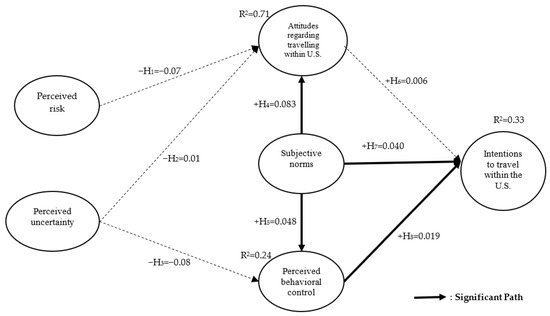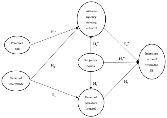 Specific research has shown that heightened perceived risks of infectious diseases within destinations have significantly affected attitudes and perceived behavioral control (PBC) [5,7,29]. For instance, Bae and Chang [7] found that, the more risk perception (cognitive/affective) increases, the more positive attitudes towards “untact” (i.e., avoiding unnecessary contact) tourism behavior result. Similarly, Sánchez-Cañizares et al. [5] found that individuals’ perceived risk due to COVİD-19 was negatively related to attitudes and PBC. Furthermore, Hsieh et al. [29] showed that perceived risk negatively impacts attitudes in their TPB model. Finally, Quintal et al. [26] found that perceived risk and uncertainty significantly and negatively influenced attitudes as perceived uncertainty was also a negative predictor of perceived behavioral control. In light of these extant findings [5,7,26,29], it is deduced that, as individuals’ perceived risk and uncertainty increase due to COVID-19, their attitudes regarding travel within the US in the near future will tend to decrease. Consequently, we hypothesize that