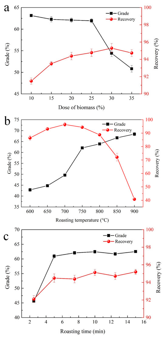- Rath, S.S.; Rao, D.S.; Mishra, B.K. A novel approach for reduction roasting of iron ore slime using cow dung. Int. J. Miner. Process. 2016, 157, 216–226. [Google Scholar] [CrossRef]