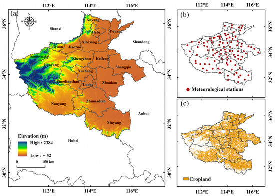 (a) Geographic location, (b) location of meteorological stations, and (c) spatial distribution of cropland of the study area.