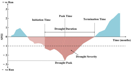 To further investigate drought structure characteristics, drought event indices were identified according to Run theory [53]. As described previously, drought events were defined as periods from a month with SPEI < −1 to a month with SPEI > 0 [49] (Figure 2). Drought events were characterized in terms of drought frequency (DF; ratio of drought events number to study years), drought duration (DD; sum of consecutive months), drought severity (DS; sum of absolute SPEI), drought intensity (DI; ratio of DS to DD), and drought peak (DP; absolute minimum SPEI during the drought event). Then, the most severe drought events were identified according to DS at the regional scale to investigate extreme drought characteristics.