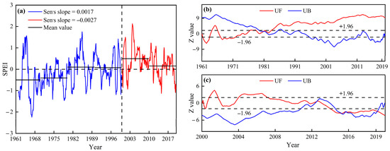 (a) Temporal variation of the 12-month SPEI-12 during 1961–2019 and abrupt changes in the SPEI-12 in Henan Province during (b) 1961–2019 and (c) 2000–2019.