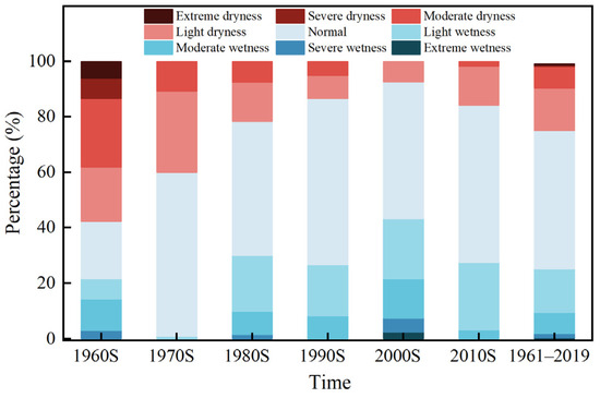 Percentage of dryness and wetness classes occurring in Henan Province during 1961–2019.