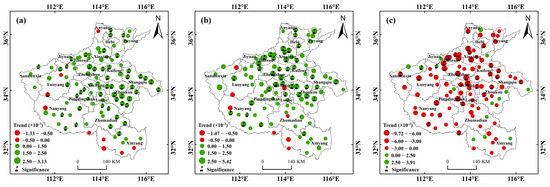 Spatial distribution of SPEI-12 trends in Henan Province during (a) 1961–2019, (b) 1961–1999, and (c) 2000–2019.