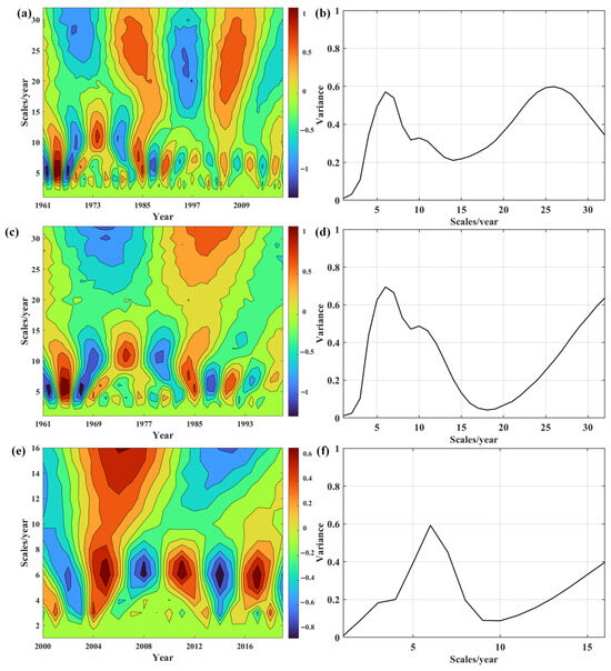 According to the real part of the wavelet coefficient contour map, there were complex multiple time scales consisting of small cycles nested within larger cycles, and the drought evolution showed two clearly different time scales of 2–10 and 20–32 years (Figure 6a). Combined with the wavelet variance plot, there were two distinct peaks in the drought evolution in Henan Province, corresponding to time scales of 6 and 26 years, respectively (Figure 6b). The largest time scale was 26 years, indicating that an approximate 26-year drought cycle had the strongest fluctuations and formed the first major cycle. The 6-year time scale corresponded to the second main drought cycle. During the period 2000–2019, there were three periods of pronounced drought and wetness, which alternated on a time scale of 2–10 years (Figure 6e). However, the contours of the oscillation periods remained open around 2019, suggesting that Henan Province may continue to experience drought after 2019.