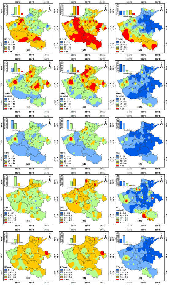 Spatial patterns of drought event characteristics including DF, MDD, MDS, MDI, and DPmax in Henan Province during (a1–e1) 1961–2019, (a2–e2) 1961–1999, and (a3–e3) 2000–2019.