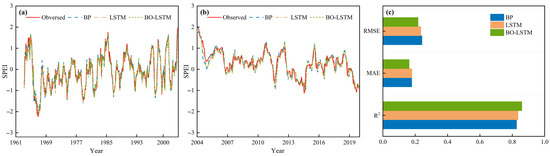 Observed SPEI-12 values for the three models during the (a) training and (b) testing periods in Henan Province and (c) performance indices in the testing data.