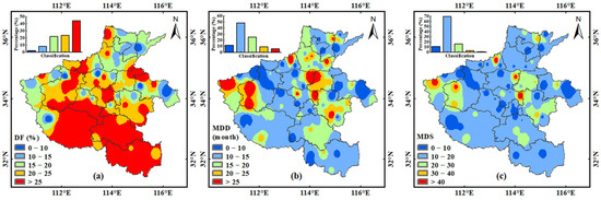 The mean DF was 24.69%, which was 1.51 times that during 2000–2019 (Figure 11a), with higher DFs of approximately 20–25 and >25 occurring in 67.89% of the study area, mainly in Zhumadian, Xinyang, eastern Nanyang, and Xuchang cities. Larger MDD values were observed across 14.61% of all areas, mainly focused in western Kaifeng, northeastern Jiaozuo, southwestern Luoyang, and Sanmenxia cities (Figure 11b). An MDS of 10–20 accounted for 69.61% of total areas, whereas those >20 accounted for 19.63%, mainly in southwestern Luoyang and Sanmenxia, western Kaifeng, and parts of Jiaozuo and Zhoukou cities (Figure 11c). The MDI exhibited a patchy spatial distribution, with regions near Anyang, Kaifeng, Zhoukou, and southern Henan Province (39.62%) showing a higher MDI (>1.0; Figure 11d). Most regions of Henan Province (75.48%) had a DPmax of 1.5–2.0, with higher DPmax observed mainly in northeastern Kaifeng, Zhoukou, Jiaozuo, and Zhumadian cities (Figure 11e).