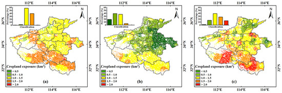 The average cropland exposure to drought of Henan Province during 1961–1999 was 33,302.81 km2, accounting for 24.32% of the total cropland area. Regions with high exposure (>1.5) were mainly distributed over Zhumadian, Nanyang, Xinyang, Pingdingshan, and Jiyuan cities (Figure 12a), accounting for 39.75% of total cropland exposure. In contrast, the cropland area exposed to drought decreased to 20 907.96 km2 (15.27% of the total cropland area) in 2000–2019, and that of high exposure (>1.5) decreased noticeably to 4.88% of total cropland exposure, with sporadic distribution in Xinyang, Nanyang, and Zhumadian cities (Figure 12b). The rate of low cropland exposure (<0.5) was observed in northern and eastern Henan Province, particularly in Shangqiu, eastern Kaifeng, and Zhoukou cities, accounting for 19.11% of total cropland exposure. In 2020–2029, the cropland area exposed to drought rose again to 33 745.12 km2, approximately 1.61-fold higher than that during 2000–2019 (Figure 12c). Cropland exposure > 1.5 accounted for 42.73% of total cropland exposure, mainly in Xinyang, Nanyang, and Zhumadian cities, whereas low cropland exposure (<0.5) showed sporadic distribution in Shangqiu and Anyang cities, accounting for 1.53% of total cropland exposure.