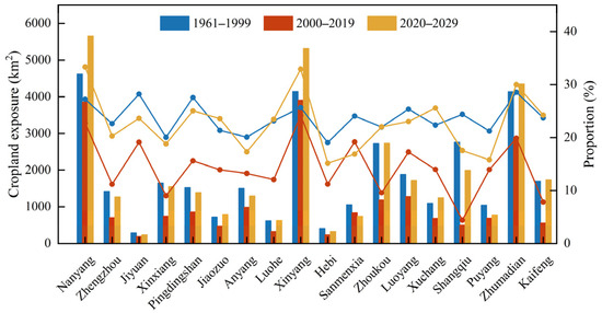 On the city scale, cropland exposure to drought was higher in Nanyang, Xinyang, and Zhumadian cities, with cropland exposure >4000 km2, whereas Zhumadian, Jiyuan, Nanyang, and Pingdingshan cities showed greater exposure during 1961–1999. However, from 2000 to 2019, all cities showed a decrease in cropland exposure, with the greatest decreases in Zhumadian, Zhoukou, Shangqiu, and Kaifeng cities. During 2020–2029, cropland exposure increased across 94.44% of all cities, particularly in Nanyang, Zhoukou, Shangqiu, Zhumadian, Xinyang, and Kaifeng cities. Notably, Sanmenxia city showed a clear decreasing trend during these two periods, with cropland exposure shifting from 1054.74 km2 to 739.77 km2 (Figure 13).