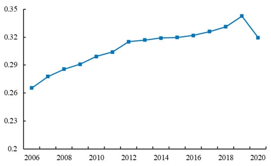 Figure 1 presents the mean values for high-quality development across China during the period spanning from 2006 to 2020. The survey period indicated that China’s high-quality development upheld a constant upward progression with a negligible dip observed exclusively in 2020. The yearly average growth rate was 1.33%. In 2020, due to the impact of the COVID-19 pandemic and the control measures correlated to it, the Chinese economy had to face significant difficulties regarding coordinated regional growth and international accessibility. The per capita consumer expenditure of consumers displayed a minor decrease from CNY 27,504 in 2019 to CNY 27,439 in 2020, indicating a slight setback in the aspect of high-quality development.
