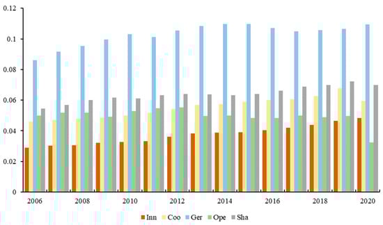 Figure 3 illustrates the national averages for each dimension of high-quality development from 2006 to 2020. It is evident from the comparison of sub-dimensions that all dimensions, barring the openness index, have experienced a fluctuating but upward trend. Of these, the innovation dimension displayed the greatest average annual growth rate at 3.74%, while the openness dimension exhibited the lowest annual growth rate. The COVID-19 pandemic has caused a significant decline in factor flows, leading to changes in import and export trends. This has consequently hindered the progression of high-quality opening up.