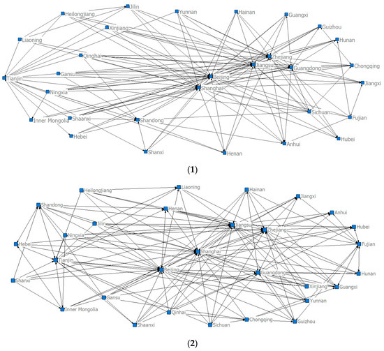 Spatial correlation network of high-quality development: (1) 2006, (2) 2020.