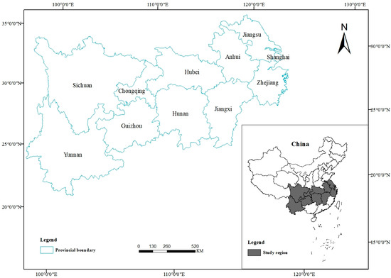 The Yangtze River Economic Belt spans across the eastern, central, and western regions of China, covering nine provinces and two municipalities (Figure 1). It is the longest and widest economic belt in China, exerting the most significant influence, making it a key component of the spatial economic strategy. The central leadership has repeatedly emphasized the strategic positioning of ecological priority and green development for the Yangtze River Economic Belt. As a leading demonstration zone for national ecological civilization construction, the Yangtze River Economic Belt bears the significant mission of achieving carbon peaking and carbon neutrality, as well as the important task of economic and social green transformation. With the support of the Yangtze River as a crucial waterway and the coordinated development of the regional economy, the logistics industry has become an advantageous industry in the Yangtze River Economic Belt, making substantial contributions to the regional economy [25]. Furthermore, this region, accounting for 21.35% of the national land area, generates approximately 40% of the country’s logistics industry value added, indicating a prominent logistics agglomeration effect in the Yangtze River Economic Belt, with strong radiation capabilities [26]. This plays a crucial role in promoting interconnectivity among regions and serves as a catalyst for spatial economic development in the Yangtze River Economic Belt. However, the logistics sector in the Yangtze River Economic Belt has not fully achieved a transformation in its development model, as energy consumption and carbon emissions remain at relatively high levels [27], resulting in a series of environmental issues that contradict the strategic positioning of ecological priority and green development in the region. Therefore, exploring the coupling coordination relationship among low-carbon logistics, industrial agglomeration, and the regional economy in the Yangtze River Economic Belt is of paramount importance in determining the future development direction and formulating relevant development strategies for the region.