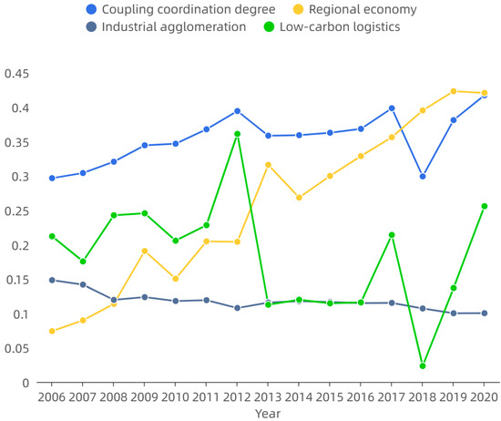 The second stage, from 2012 to 2013, witnessed a significant decline in the coupling coordination data. Generally, the development level of subsystems is related to the overall level of coupling coordination within the system. During this stage, regional economic development surged, with a noticeable increase in the growth rate, while industrial agglomeration achieved growth after nearly six years of stagnation. In contrast, the development of green logistics was lagging, reaching its lowest point since 2006 in 2013. This indicates that rapid economic expansion resulted in a significant increase in logistics output and the rapid concentration of the logistics industry in the short term, leading to increased energy demand and a sharp rise in carbon dioxide emissions. As a result, the three systems were in a disordered state, and the level of coordinated development was reduced.
