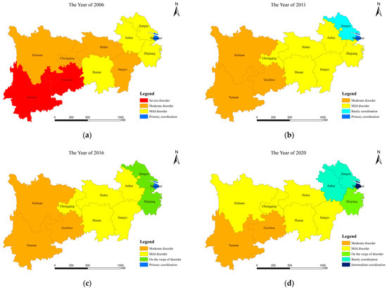 Spatial distribution trend of the coupling coordination of the three systems in the Yangtze River Economic Belt from 2006 to 2020. (a) Spatial distribution trend of the coupling coordination of the three systems in the Yangtze River Economic Belt in 2006; (b) Spatial distribution trend of the coupling coordination of the three systems in the Yangtze River Economic Belt in 2011; (c) Spatial distribution trend of the coupling coordination of the three systems in the Yangtze River Economic Belt in 2016; (d) Spatial distribution trend of the coupling coordination of the three systems in the Yangtze River Economic Belt in 2020.