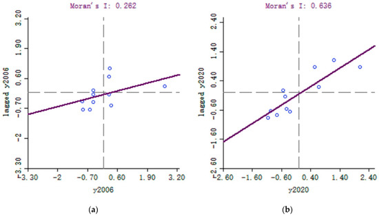 Local Moran’s I scatterplots of the coupling coordination in 2006 and 2020. (a) Local Moran’s I scatterplots of the coupling coordination in 2006; (b) Local Moran’s I scatterplots of the coupling coordination in 2020.