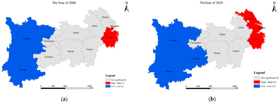 LISA agglomeration maps for the Yangtze River Economic Belt in 2006 and 2020. (a) LISA agglomeration maps for the Yangtze River Economic Belt in 2006; (b) LISA agglomeration maps for the Yangtze River Economic Belt in 2020.