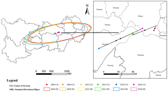The figure reveals that the center of gravity of the coupling coordination in the Yangtze River Economic Belt during 2006–2020 is predominantly located in the southeast of Hubei Province, migrating among Wuhan, Xianning, and Jingzhou. This indicates that the spatial distribution of coupling coordination among the three systems remained relatively stable over the study period, exhibiting an “east strong, west weak” spatial pattern. In terms of specific time periods, the center of gravity coordinates of the ellipse initially shifted in the northeast direction by 10.34 km from (114.43 E, 30.09 N) in 2006. Subsequently, it continued to migrate in the southwest direction by 50.44 km from (114.48 E, 30.17 N) in 2009. From 2012 to 2015, the coordinates shifted by a smaller distance of 3.84 km in the northwest direction from (113.97 E, 30.05 N). Between 2015 and 2018, the coupling coordination coordinates further migrated by 76.27 km in the southwest direction from (113.96 E, 30.08 N). The eastern region of the Yangtze River Economic Belt, including Shanghai, Hangzhou, and Jiangsu, benefits from favorable location conditions and strong economic capabilities. As a result, it exhibits higher levels of logistics industry agglomeration and green development, leading to stronger coordination with the regional economy. Consequently, after a certain period of development, the level of coupling coordination has reached a high point, and the impetus for further synergistic growth may gradually diminish. In contrast, the western provinces and cities have relatively weak economic foundations and industrial structures in the early stages of development, and they have a lack of awareness regarding ecological protection. After the initial phase of extensive development, the western provinces and cities have made efforts in building a green and low-carbon production and lifestyle, establishing ecological barriers, and achieving sustainable development. As a result, the coupling coordination situation among the three systems has been continuously optimized, leading to a more significant enhancement effect and a great development potential. Between 2018 and 2020, the coordinates shifted from (113.22, 29.86) to (114.19, 30.15), with a migration distance of 98.15 km. This is related to the development of regional integration in the Yangtze River Delta region, which includes Shanghai, Jiangsu, Zhejiang, and Anhui. In 2018, Chinese leaders announced the elevation of the regional integration of the Yangtze River Delta as a national strategy during the China International Import Expo. This development is of great significance in promoting the connectivity of major transportation corridors and fostering the formation of a coordinated and collaborative logistics system along the coastal and river areas. It contributes to the enhancement of regional economic agglomeration and competitiveness, thereby achieving sustainable development of the regional economy and society.