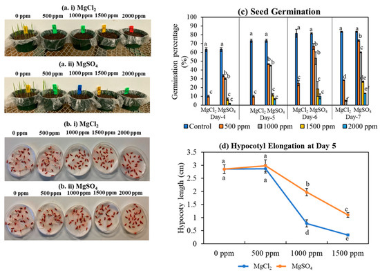 Excess Mg reduced germination and hypocotyl elongation in rice. (a,b) Photos of germinated rice seeds exposed to different levels of magnesium salts. (a(i,ii)) Seeds were directly sown on soil treated with 0, 500, 1000, 1500, and 2000 ppm concentration of magnesium salts. Photographs were taken at 7 DAS. (b(i,ii)) Seeds were sown in petri dishes with wet filter papers containing 0, 500, 1000, 1500, and 2000 ppm of magnesium salts. Images were taken five days after incubation. (c) Germination percentage of rice seeds grown under different levels of magnesium salts. (d) Hypocotyl elongation of rice seeds incubated under different levels of magnesium salts. Data represents means ± SE. Different letters (a, b, c, d, e, and f) indicate significant differences between means (n = 20, Fisher LSD test at α = 0.05).