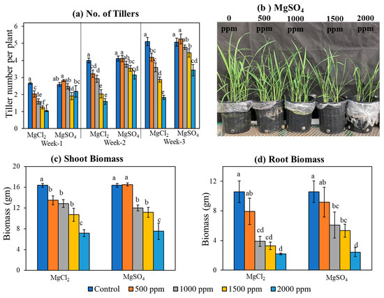 Both sources of magnesium salt caused a dose-dependent reduction in the number of tillers, shoot biomass, and root biomass (Figure 2b). The number of tillers per plant reduced from an average of 5.2 per plant under non-stress control conditions to approximately 3.0 and 1.4 tillers per plant at the highest Mg level (2000 ppm) for MgSO4 and MgCl2, respectively (Figure 2a). Similar to the tiller number per plant, shoot and root biomass were reduced from 16 gm and 12 gm per plant under non-stress conditions to 7.0 gm and 2.3 gm per plant, respectively, at the highest Mg level (2000 ppm) for both Mg salts (Figure 2c,d). Interestingly, under excess soil Mg supply, the shoot biomass was reduced by two-fold, whereas the root biomass was reduced by more than three-fold.