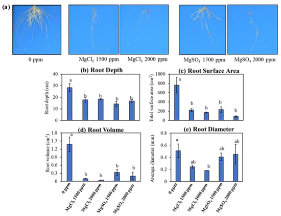 Effect of magnesium salt input on rice root morphological features. (a) Scanned images of rice roots exposed to 0 ppm, 1500 ppm, and 2000 ppm of magnesium salts. (b–e) Root morphology of ‘XP 753’ rice grown under different concentrations of magnesium salts. Data represent means ± SE. Different letters (a and b) indicate significant differences between means (n = 3, Fisher LSD test at α = 0.05).