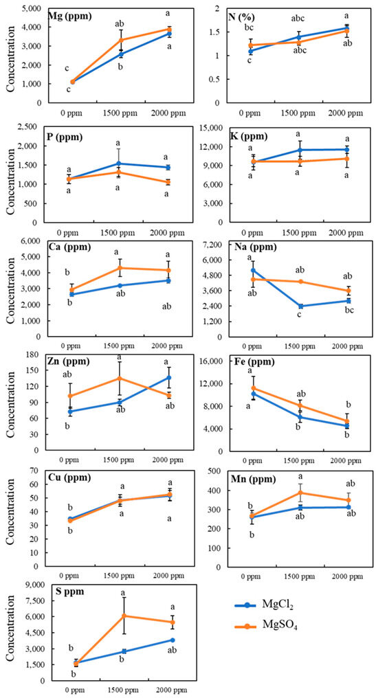 We further evaluated the effect of magnesium salt treatment on grain mineral contents (Figure 7). Unlike tissue nitrogen content, grain nitrogen content decreased from 2.3% under normal conditions to 2.1% and 1.8% for MgCl2 and MgSO4, respectively, under the highest dose, 2000 ppm, of magnesium salt. Surprisingly, no significant change in grain magnesium content was observed for either source, MgCl2 and MgSO4, of magnesium salts. Similarly, soil magnesium application did not alter other grain mineral concentrations, including phosphorus, potassium, sodium, zinc, iron, and manganese. However, grain copper, sulfur, and calcium concentrations were significantly increased under magnesium salt treatment.