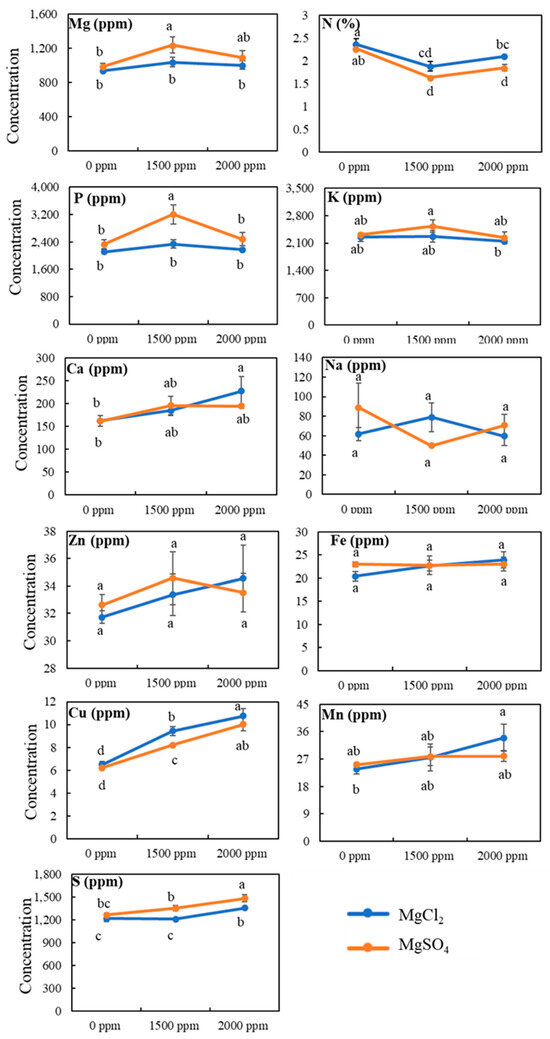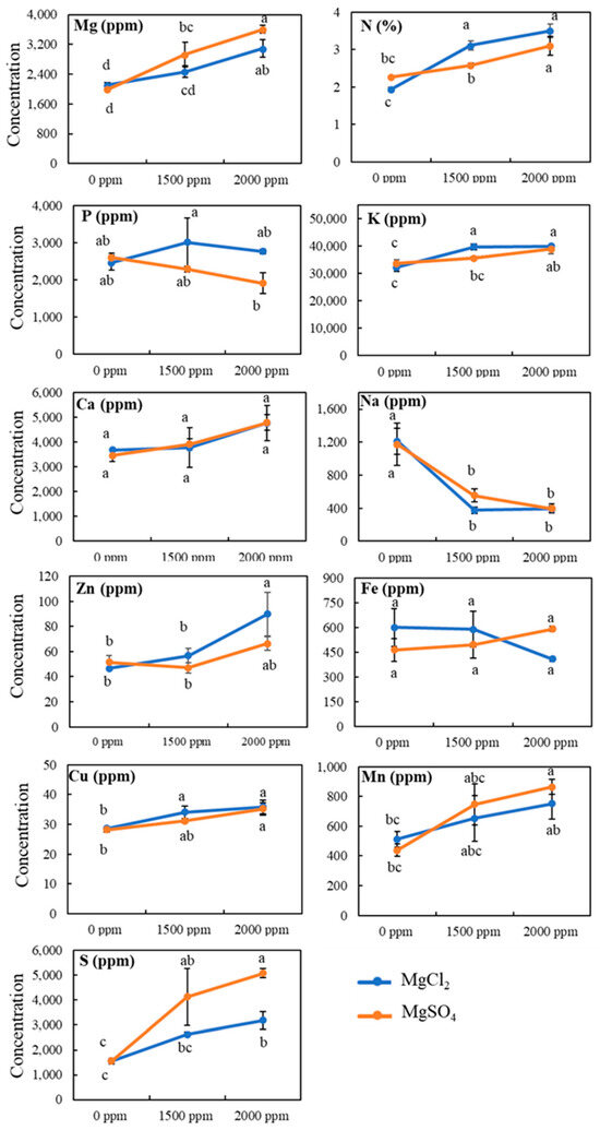 Effect of magnesium salt treatment on shoot mineral contents. Data represent means ± SE. Different letters (a, b, c, and d) indicate significant differences between means (n = 3, Fisher LSD test at α = 0.05).