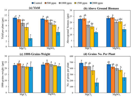 Impact of excess magnesium salt on yield and yield parameters in a rice variety ‘XP 753’. Data represent means ± SE. Different letters (a, b, c, d, e, and f) indicate significant differences between means (n = 3, Fisher LSD test at α = 0.05).
