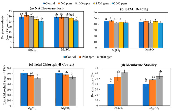 Effect of magnesium salt doses on (a) net photosynthesis, (b) SPAD reading, (c) membrane stability, and (d) total chlorophyll content. Data represent means ± SE. Different letters (a, b, c, d, and e) indicate significant differences between means (n = 3, Fisher LSD test at α = 0.05).