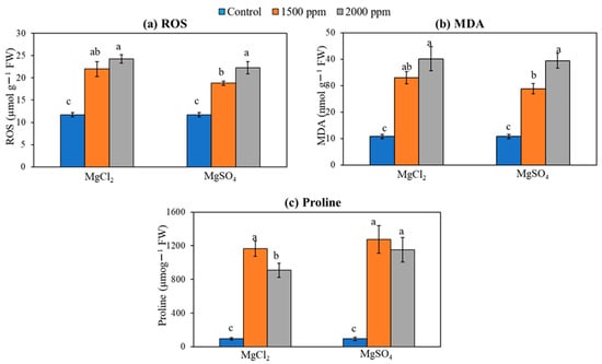 Effect of magnesium salt doses on (a) ROS, (b) MDA, and (c) proline contents. Data represent means ± SE. Different letters (a, b, and c) indicate significant differences between means (n = 3, Fisher LSD test at α = 0.05).