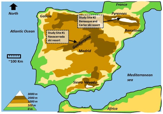 Spain is not a country known for its mountains and winter conditions but rather for its artistic culture, folklore, and beaches. However, it is worth highlighting some little-known aspects about the country: Its average altitude (average elevation) is 660 m.a.s.l. (meters above sea level), making it the eleventh most mountainous nation in Europe. For example, Austria’s average altitude is 910 m.a.s.l, and France’s is 375 m.a.s.l. []. Spain is crossed by a large number of mountain ranges, including the Pyrenees with 217 peaks over 3000 m.a.s.l. [] (some of which have small glaciers). The Sierra Nevada is a mountain range in southern Spain and includes the Mulhacén summit, which at 3479 m.a.s.l., is the highest mountain in Europe outside the Caucasus and the Alps []. Although much of Spain has a Mediterranean climate with hot summers and relatively mild winters, the north has an Atlantic climate that is influenced by storms from northern Europe, which often leave significant snowfall in the mountains. The interior of the peninsula has a non-extreme continental climate; low temperatures can be reached with significant frosts for several months of the year. The lowest temperature recorded in Spain in a non-mountainous and inhabited area was −30 °C (recorded in December 1963 in Calamocha in Teruel) []. The coldest measurement made at an official weather station was −32 °C as recorded at Estany Gento in the Lleida Pyrenees in February 1956. The Philomena storm in January 2021 set the record for a non-official weather station measurement with −34 °C measured at the Baqueira Beret ski resort in the Pyrenees []. There are 30 Spanish alpine ski resorts [] (15 in the Pyrenees, 7 in the Cantabrian Mountains, 4 in the Iberian System, and 4 in the Central System and the Sierra Nevada). This final range is the southernmost range in Europe and the highest in Spain—and from whose peaks the Strait of Gibraltar and Africa are visible.