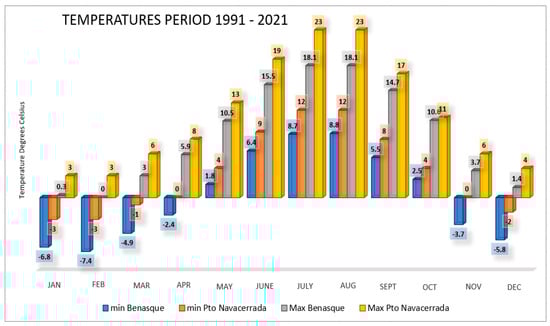 Two differing study areas have been chosen within the Spanish high mountains (Figure 1). The first area is the winter alpine ski resort of Navacerrada in the Sierra de Guadarrama at an altitude of 1858 m.a.s.l. (located just 60 km from Madrid). And the second area is Llanos del Hospital-Benasque in the Pyrenees in the province of Huesca and near the French border. It is an area with a great tradition of alpine sports, Nordic skiing, and mountaineering. Figure 2 shows histograms of average monthly maximum and minimum temperatures for the two study locations.