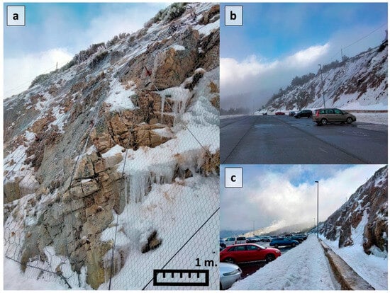 Slopes 1, 2, 3, and 4 are located near the resort carpark, and the measurements were made on 20 January 2023 after a nighttime temperature of around −7 °C and several weeks of below-zero temperatures. The excavated slopes are made of jointed and weathered granite that suffers a freeze–thaw effect. There are abundant “blue” icefalls and frozen joints (Figure 3 and Table 1). The slopes show minor instabilities. The need to protect the carpark below has made it necessary to install wire mesh and cables with intensive bolting. Slope 5 is in the nearby Morcuera mountain pass. The rock is highly weathered gneiss and grade IV (almost converted into residual soil) in some areas. The slope angle is less steep than Navacerrada and contains no reinforcements.