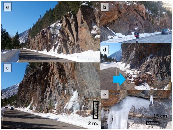 Study site 2: Llanos del Hospital (Benasque, Pyrenees) cross-country ski resort and road to the French border. Temperature during the field trip day (maximum) +4 °C, night −12 °C. (a) Toppling problems at slope 6; (b) wedge failure at slope 9; (c) toppling and ice falls at slope 8; (d) fallen blocks; (e) frozen joints and ice cracking.