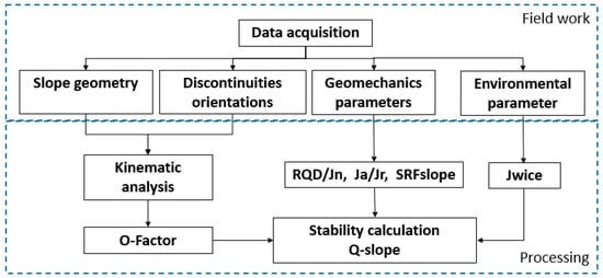 Figure 7 shows the work process in field and office. This procedure is valid for practical engineering applications, as well as research and teaching. A small area of about 5 m was initially chosen on each slope or in each relevant area, which we term a geomechanical station. Using normalized templates, we gathered in situ data on matrix, joint, and rock mass parameters (such as the joint roughness coefficient, simple compression, joint spacing, and joint orientation). This template and data should be an ambitious gathering of data and not focus, as sometimes happens, only on RMR geomechanical classifications and Q. With the data from a field template, we then determined the following parameters: shear joint strengths; matrix strengths; slope geometries; and of course, the input parameters of geomechanical classifications—usually RMR and Q [,] if it is an underground work, and SMR (Roman) and Q-slope [,,,] if it is a slope. Collecting this data usually takes one hour. It is important to have templates ready so that we do not forget anything, and data collection must be simplified as much as possible if conditions in the field are adverse.