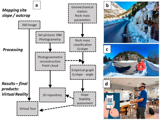 Flowchart of the field and processing progress to obtain the geomechanical parameters (and stability assessment), as well as the VR and 3D results; (a) shows research progression from field data acquisition to results. (b) shows some icefalls where the field campaign is developed. (c) is the 360° spheric view seen when operating the camera through an app. (d) shows the virtual reality platform.