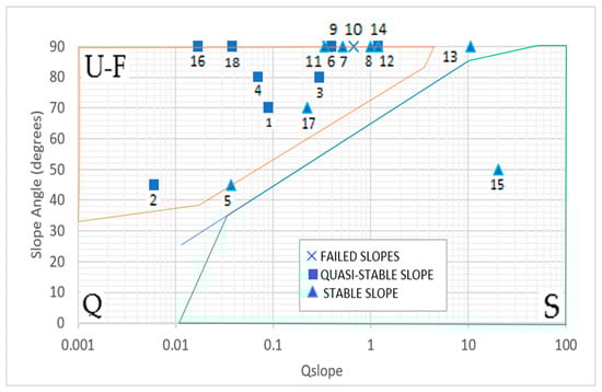 We consider that slopes with good Q-slope geomechanical qualities and moderate heights can be perfectly vertically stable. Part of the graph could be modified as in the case indicated in Jordá 2017 []. Visually stable slopes 5 and 15 appear as stable in Figure 9 given the angle of the Q-slope. In the present work, we provide new data for the Barton and Bar Q-slope criterion []. Figure 9 shows many slopes with a few instabilities positioned in the part of the graph that corresponds to “unstable–failed” (namely, slopes 16, 18, 4, 1, and 17). Slope 5 is on the boundary line. These new data “collaborate” in fixing the limits or boundaries between the stable and unstable slopes. Slope 2 has an inclination of 45° and is stable, but it is located in the unstable zone. It is important to notice that the lower left area of the graph has very little data, and the limit line in this sector should be reviewed or analyzed more carefully. We also recommend evaluating the boundary between unstable and transitional for vertical slopes (90°) with Q-slope qualities greater than 1.