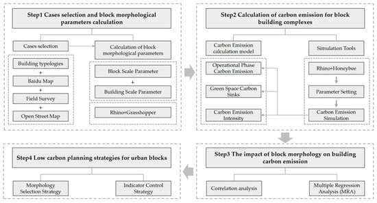The overall technical workflow for this work was broken down into four steps, as shown in Figure 2. Step 1 involved case selection and block form parameters. Step 2 involved the calculation of CEs for block building complexes. Step 3 examined the relationship between block form parameters and buildings’ CEI. Step 4 analyzed low-carbon planning strategies for urban blocks.