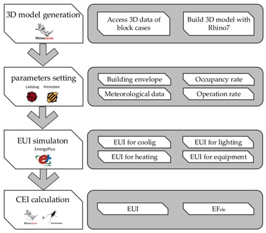 Relevant research on building energy consumption predictions [48] has shown that the mainstream hourly building energy consumption simulation software packages include DOE-2, eQUEST, ESR-r, and Energy Plus. Research on block-scale building energy consumption prediction [40,51] has shown that Energy Plus takes into account the impact of a building’s surrounding environment on its BEC. This study considered the integration and operability of software platforms for 3D modeling and energy consumption simulation, and it adopted the Rhino and Grasshopper parametric platforms as simulation tools. The simulation tools used in this study have been validated in previous studies by our team [40,51]. This study employed the Ladybug Tools simulation plug-in to realize the residential block building energy consumption simulation, and the simulation process is shown in Figure 4.