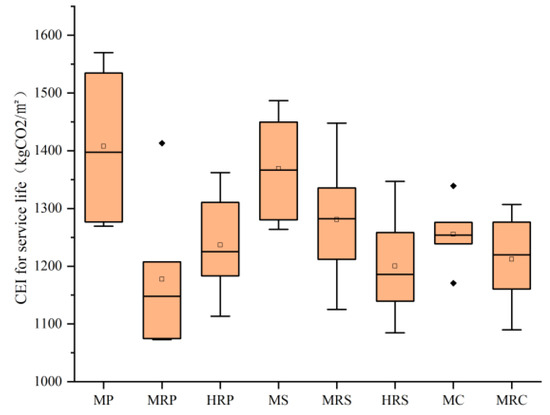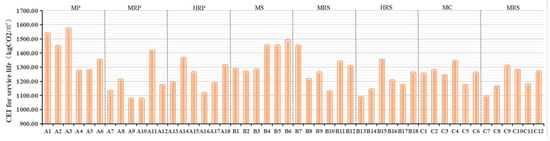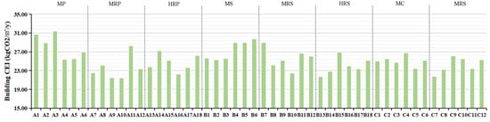 The distribution characteristics of the building CEIs for the service lives of the 48 residential blocks in Wuhan are shown in Figure 5. The data results demonstrated in the figure show that different residential blocks had different distributions of their building CEIs, and the building CEIs for the buildings’ service lives ranged from 1070 to 1570 kg CO2/m2. Among these, the residential block with the smallest building CEI for its service life was A10, with 1073.08 kg CO2/m2, while the residential block with the largest building CEI for its service life was A3, with 1569.79 kg CO2/m2.