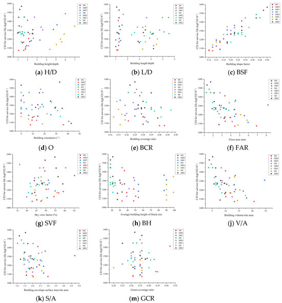 The scatter diagrams of morphological parameters and building CEI. The subfigure of (a–m) represent the scatter diagrams between H/D, L/D, BSF, O, BCR, FAR, SVF, BH, V/A, S/A and GCR and building CEI for service life, respectively.