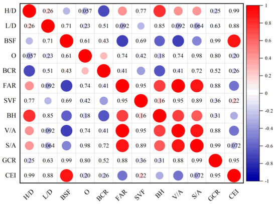 Using the calculated values of the form parameters in the residential blocks and the assessment results for the CEIs during operation, this section analyzed the impact of the residential blocks’ morphological parameters on the buildings’ CE. A building’s CEI was considered as the building’s carbon emissions and carbon sinks. This study took the building carbon emissions as the dependent variable Y and the residential block form parameters as the independent variable X, and it adopted the correlation analysis method to conduct a correlation analysis between the two variables. The scatter diagrams for the residential blocks’ form parameters and the buildings’ CEIs are shown in Figure 10, and the correlation analysis results are shown in Figure 11 and Table 5. If the significance value (p) was below 0.05, it indicated a significant correlation between the independent variable and the dependent variable. The correlation analysis results showed that there was no correlation between the H/D, L/D, and GSR and a building’s CEI. There was a negative correlation between the O, BCR, and S/A and a building’s CEI, and there was a positive correlation between the SVF and a building’s CEI, but it was not significant. Although there was a positive correlation between the SVF and a building’s CEI, it was not found to be statistically significant. On the other hand, there was a significant positive correlation between the BSF and a building’s CEI at the 0.01 level. Similarly, there was a significant negative correlation between the FAR and V/A and a building’s CEI at the 0.01 level. Additionally, the BH demonstrated a significant negative correlation with a building’s CEI at the 0.01 level. The BSF had the highest impact on a building’s CEI, accounting for 0.910 of its correlation coefficient (r). This was followed by the FAR, with a correlation coefficient of -0.547, then the V/A, with a correlation coefficient of −0.547, and lastly, the BH, with a correlation coefficient of −0.328.