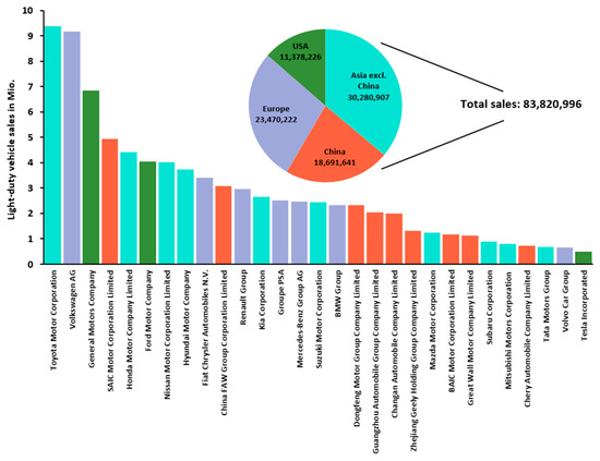Overview of all OEMs considered in this study with their area of origin (the total sales number of a region equals the worldwide sales of all OEMs based in this region) and light-duty vehicle sales in calendar year 2020 [28,29,30,31,32,33,34,35,36,37,38,39,40,41,42,43,44,45,46,47,48,49,50,51,52,53,54,55,56,57,58,59,60,61,62].