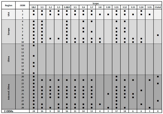 Overview of the OEM carbon reporting scopes for the reporting year 2020 (A black square symbolizes an active carbon reporting by an OEM for a respective scope.). The emission scopes are defined according to the GHG Protocol (see Section 2.1.2).